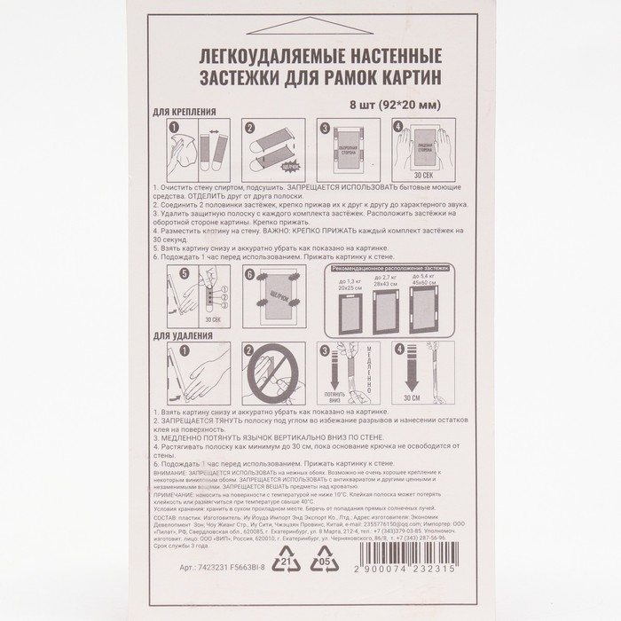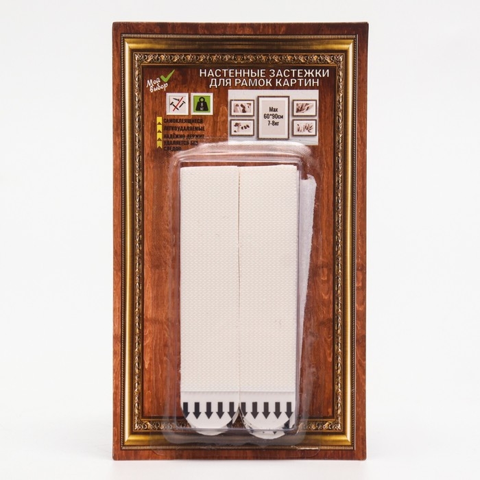С помощью клейкие застежки Мой выбор ( липучки, крючки на стену, крепеж, полоски) можно легко и безопасно крепить разнообразные аксессуары на вертикальной поверхности. Вы не портите стены, не шумите, не сверлите, никаких лишних движений. При необходимости можно удалить, потянув за клейкую полоску. Благодаря настенным застежкам можно эстетично крепить к стене все что угодно соблюдая весовую нагрузку - роутер, часы, полки, рамки, картины. Одна застежка фиксируется на стене, а другая - на раме. Именно поэтому Вы можете вешать и снимать Ваши фотографии, предметы интерьера столько раз сколько пожелаете. Соблюдайте инструкцию по применению на оборотной стороне упаковки! Подходит для твердых, ровных поверхностей и окрашенных стен. Не подходит для бумажных или виниловых обоев, шероховатых поверхностей.