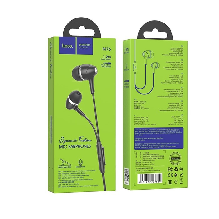 Наушники Hoco M76, проводные, вакуумные, микрофон, Jack 3.5 мм, 1.2 м, черные