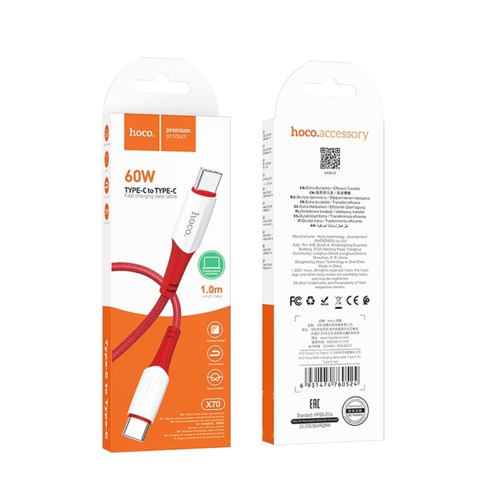 Кабель Hoco X70, Type-C - Type-C, 60 Вт (зарядка ноутбука), 3 А, 1 м, нейлон оплетка,красный
