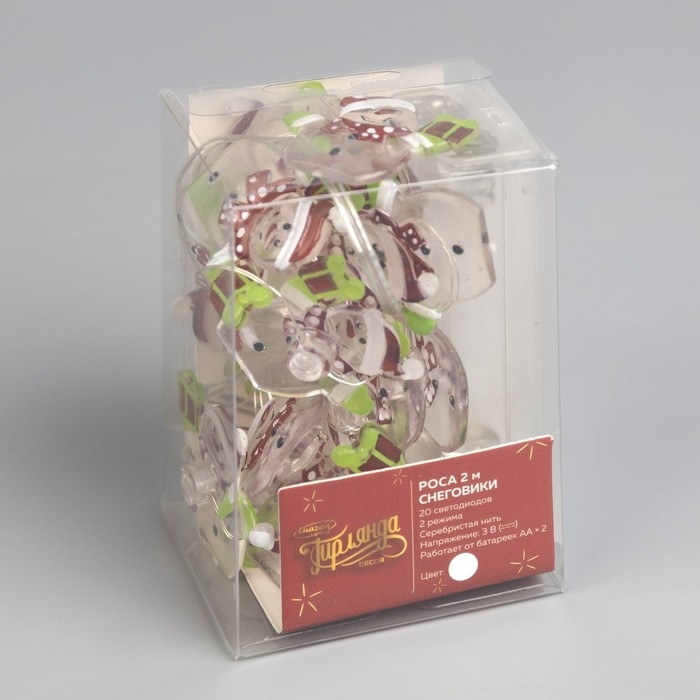 Гирлянда «Нить» 2 м роса с насадками «Снеговик», IP20, серебристая нить, 20 LED, 2 режима, батарейки ААх2 (нет в комплекте), свечение белое