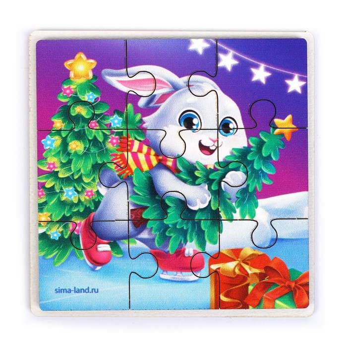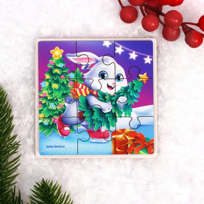 Дервянные пазлы на новый год «Зайка спешит на праздник»