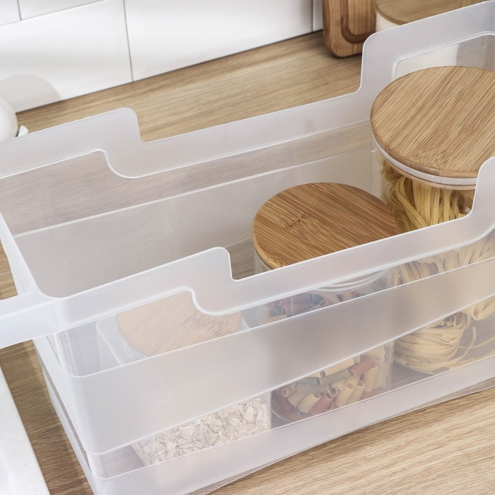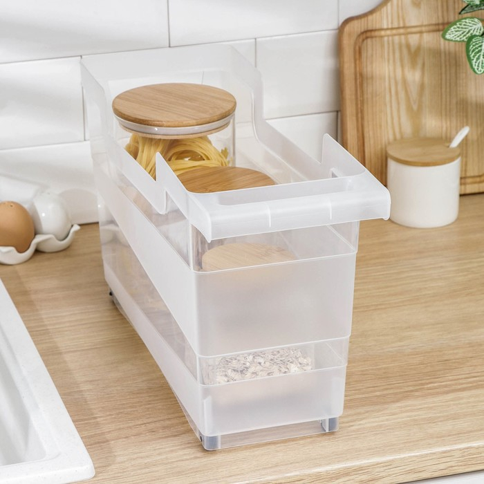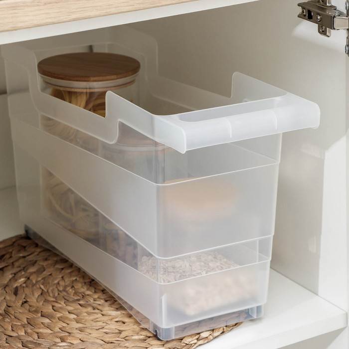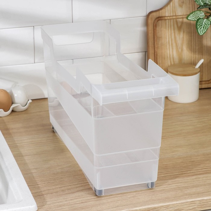 Вместительный контейнер на колесах обеспечит удобное хранение продуктов в холодильнике, либо различных вещей в любом шкафе, полке, на столе. Предотвратит падение бутылочных изделий, обеспечит сохранность хрупких предметов.