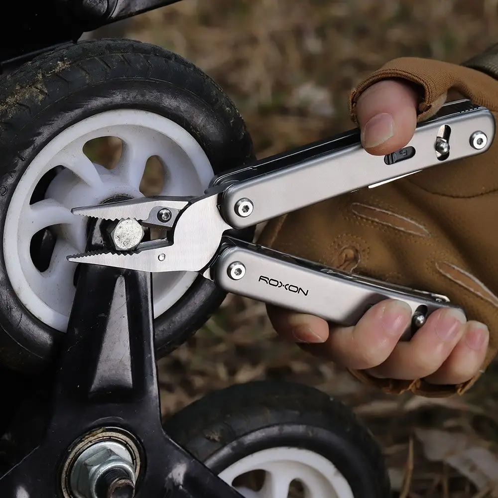 Мультитул Roxon Flex S804G — универсальный мультитул с возможностью выбора и замены инструментов. Эта функция значительно облегчит инструмент и добавит ему эргономичности. Для добавления или замены инструментов предусмотрены 10 слотов — по 5 в каждой ручке. Каждый инструмент легко заменяется и фиксируется с помощью специального механизма.