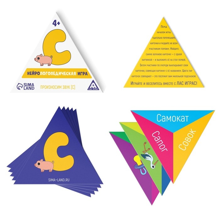 В этой игре участникам предстоит соединять треугольные карточки так, чтобы собрать картинку и название изображенного на ней предмета или персонажа. Таким образом в игровой форме можно автоматизировать звук [С]. В конце игры у вас получится один большой треугольник.
