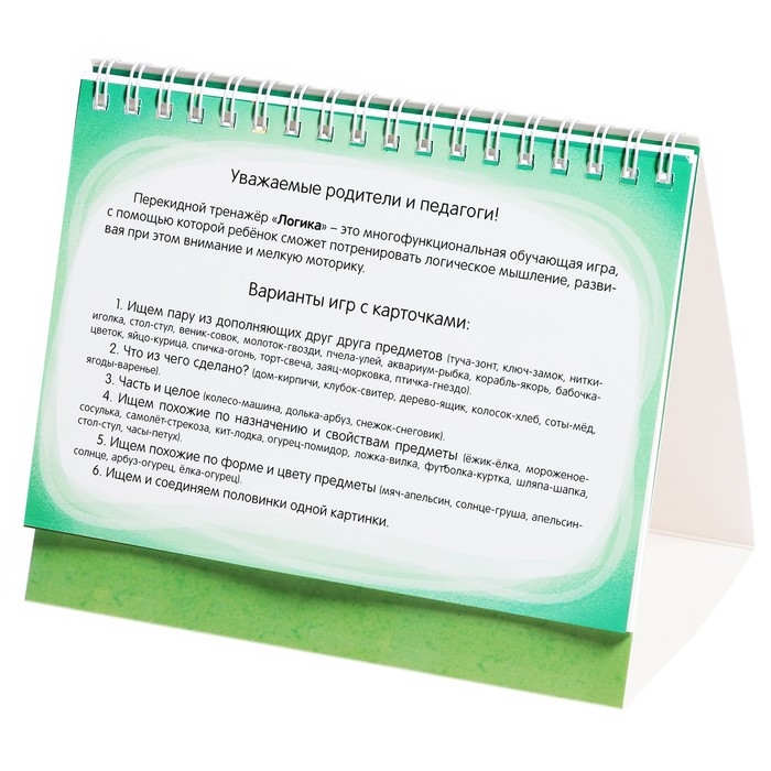 Перекидной тренажёр направлен на развитие логического мышления. С помощью этой многофункциональной игры ребёнок потренирует мышление, мелкую моторику, память и внимательность.