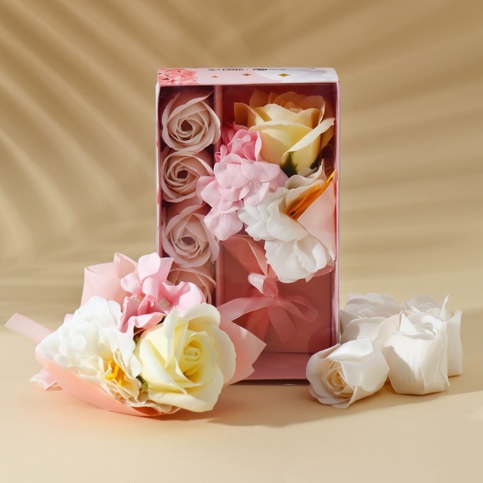 Набор мыльных роз в коробке 8 штук, розово-белые с зайчиком