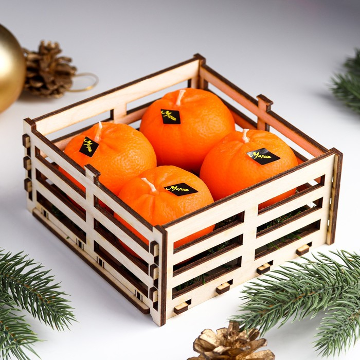 Набор новогодних свечей "Мандарины в ящике", 4 шт, 13,6×13,6×6,6 см