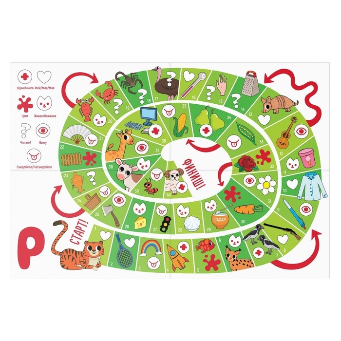Игроки по очереди бросают кубик и передвигают свою фишку на выпавшее число клеток. На поле есть специальные обозначения, их нужно учитывать и выполнять задания. Например, назвать, какое количество предметов нарисовано на поле. Или назвать цвет предмета, его размер, и так далее.