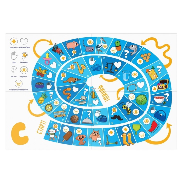 Игроки по очереди бросают кубик и передвигают свою фишку на выпавшее число клеток. На поле есть специальные обозначения, их нужно учитывать и выполнять задания. Например, назвать, какое количество предметов нарисовано на поле. Или назвать цвет предмета, его размер, и так далее.