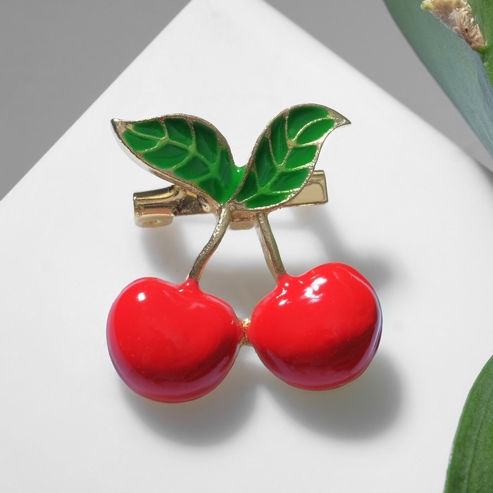 Брошь «Вишенки» пара с листом, цвет красно-зелёный в золоте (неделимая фасовка 12 шт., цена за шт.)