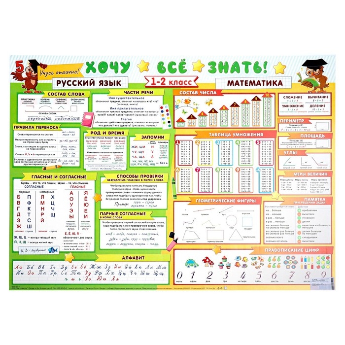 Плакат А2 "Хочу всё знать" русский язык, математика, 1-2 класс, 70х50 см