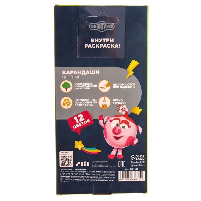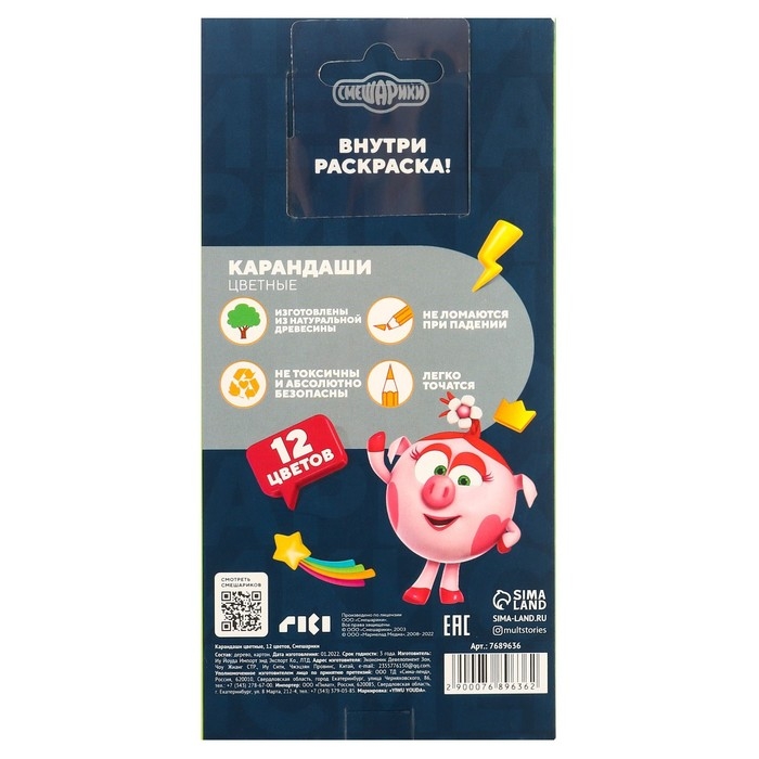 Карандаши цветные 12 цветов, заточенные, картонная упаковка, европодвес, Смешарики