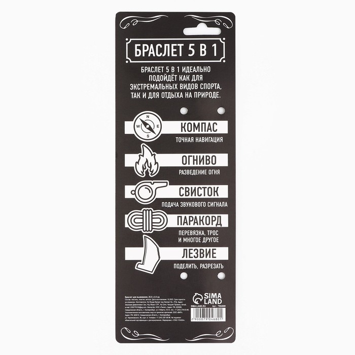 Браслет 5 в 1 идеально подойдет как для экстримальных видов спорта, так и для одтыха на природе. Очень полезная, а иногда и незаменимая вещь в походе, туристических поездках, для выживания, и просто красивый и стильный аксессуар для повседневной жизни. Можно использовать в видах спорта: рыбная ловля, охота, рафтинг, байдарка, каяк, гидроцикл, вейкборд, лодка, лыжи, самокат, ролики, скейтборд, спортивный велосипед.