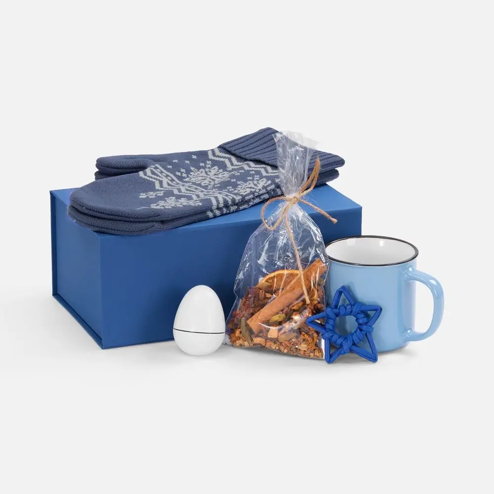 варежки - акрил 100%; футляр для бальзама - пластик; кружка - фаянс; плетеная фигурка - бумага; коробка - переплетный картон, бумага Malmero «Скандинавский синий»
