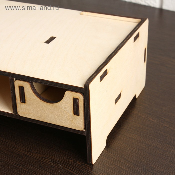 Подставка позволяет удобно расположить монитор на уровне глаз, а небольшие лотки помогут грамотно организовать рабочее пространство, убрав нужные мелочи.