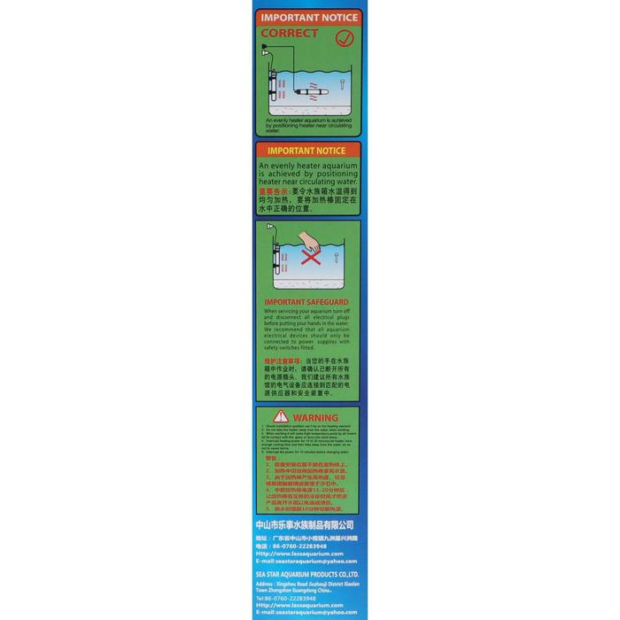 Для более равномерного прогрева всей толщи воды его следует установить в месте, где проходит течение (например, возле выхода воды из фильтра). Обогреватель необходимо подключать к розетке только после того, как он будет полностью погружен в воду. Обязательно отключайте его от сети при обслуживании аквариума. Перед тем, как достать устройство из воды, дайте ему остыть.
