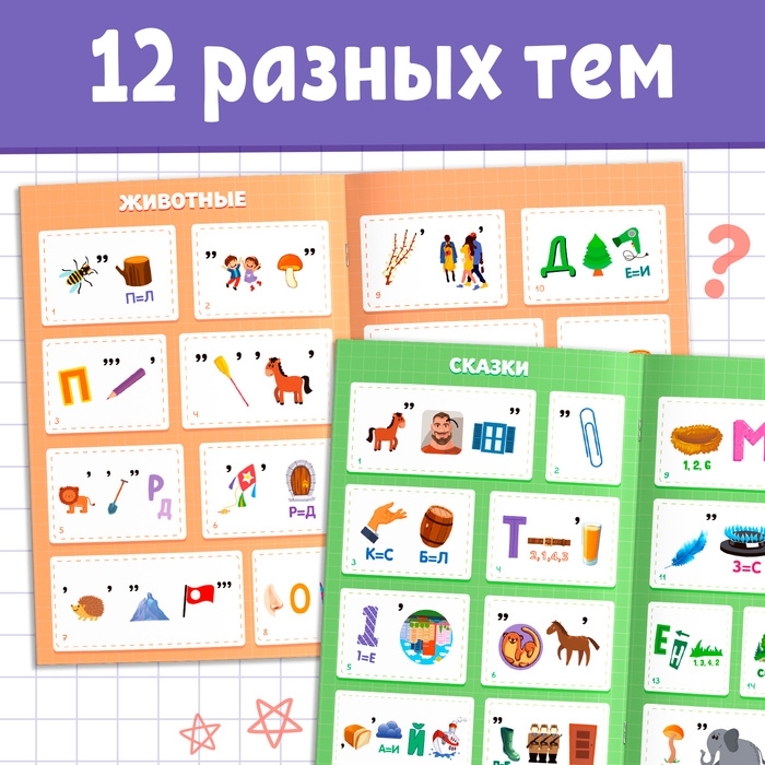 - Внутри вы найдёте ребусы на разные темы: дом, животные, сказки, спорт, транспорт и др.