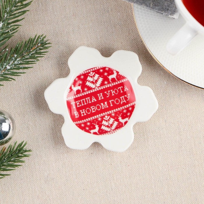 Новый год. Подставка керамическая под чайный пакетик «Тепла и уюта», 8 х 9 см, цвет белый