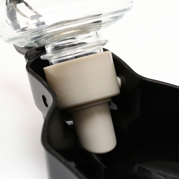 Бутылка для собак проста в использовании. Бутылка для собак откручивается от лотка, наполняется водой, затем снова прикручивается. Далее для поступления необходимого количества воды нужно нажать на бутылку и вода поступит в контейнер для питья собаки. В вертикальном положении поилка не протекает.