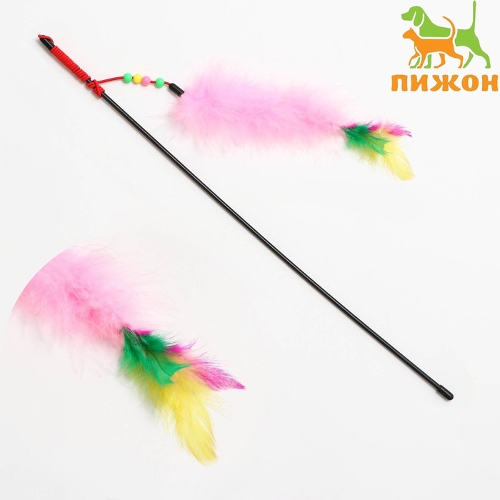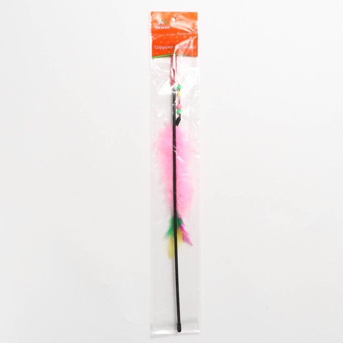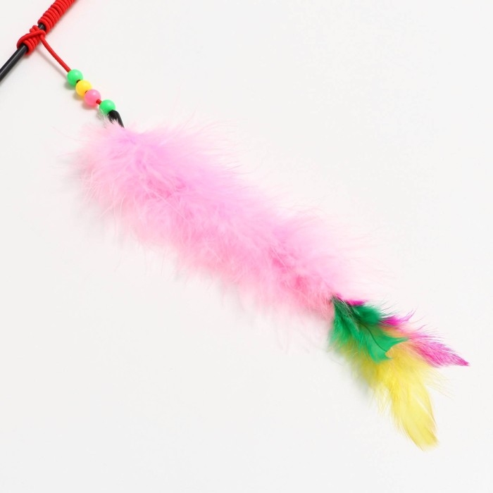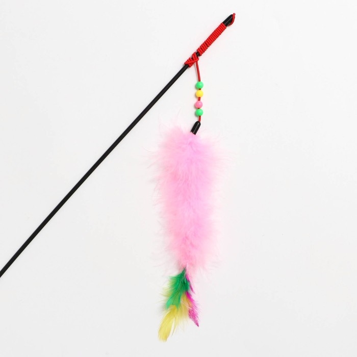 Дразнилка-удочка с перьями, пуховым хвостиком и бусинами, розовая