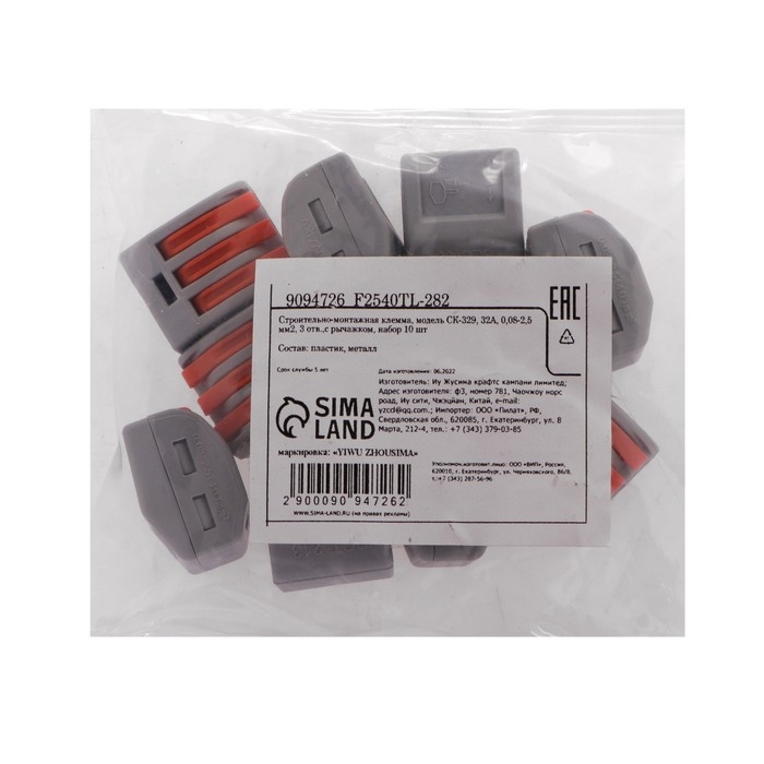 Строительно-монтажная клемма, СК-329, 32А, 0,08-2,5 мм2, 3 отв.,с рычажком, набор 10 шт