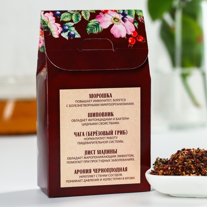 Состав: морошка (ягода), шиповник майский, чага (берёзовый гриб), листья малины, арония черноплодная.
