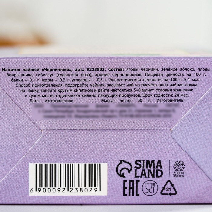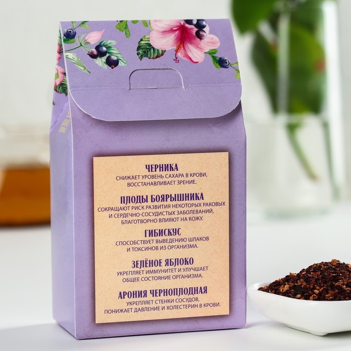Состав: ягоды черники, зелёное яблоко, плоды боярышника, гибискус (суданская роза), арония черноплодная.