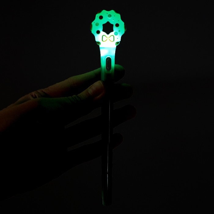 - Нажмите на кнопку, и фигурка на ручке загорится (батарейки есть в комплекте).
