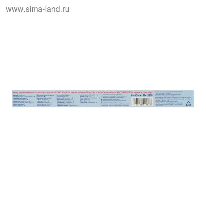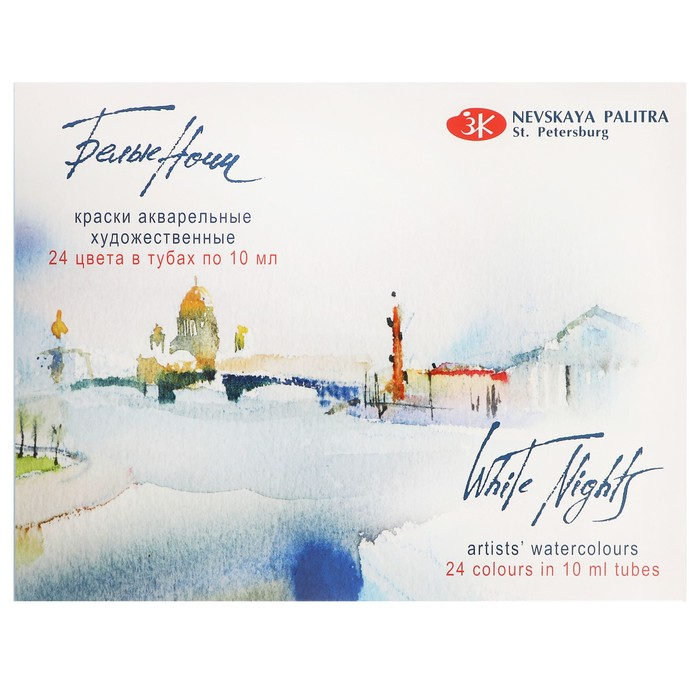 Профессиональные художественные акварельные краски "Белые ночи" представляют собой тонкодисперсные суспензии пигментов и наполнителей в связующем, в состав которого входит водный раствор растительного клея – гуммиарабика. Все акварельные краски в палитре "Белые ночи" безопасны, сертифицированы и соответствуют стандартам ASTM D-4236. Высокая концентрация пигмента обеспечивают максимальную интенсивность цветового тона акварели. Насыщенность сохраняется даже при разбавлении большим количеством воды. Отличаются прозрачностью, что дает возможность художнику работать тонкими лессировками. Чистые цвета позволяют писать в смесях и получать богатое многообразие оттенков. Основная часть красок обладает высочайшим показателем светостойкости, что способствует сохранности работ свыше 100 лет. Все это обеспечивает их высокое качество и возможность использования в ответственных работах. Краски в тубах обладают пастообразной консистенцией, не требуют дополнительного размачивания водой и сразу готовы к применению. Рекомендуются для живописи на больших форматах, для смешивания красочных растворов, для заливок больших участков бумаги, для заполнения пустых кювет. Сбалансированная палитра из 24 цветов в наборе "Белые ночи" позволяет решить множество творческих задач акварелиста. Набор представлен в пластиковом коррексе и картонном чехле.