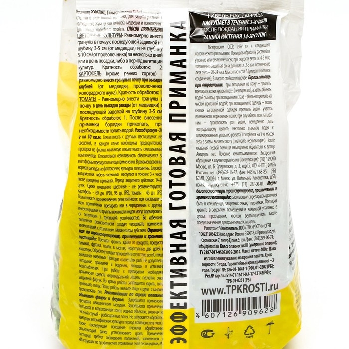 Гранулы от медведки и проволочника Rubit Рофатокс 400 г профи 59023 - готовая приманка для уничтожения садовых вредителей.Способ применения: гранулы необходимо равномерно распределить по почве, после чего их следует заделать на глубину 3-5 см (от медведки) и на глубину 5-10 см (от проволочника). Также необходимо вносить гранулы в почву на глубину 5-10 см до посадки клубней (луковиц) растений или в период вегетации (от проволочника). Норма расхода: 30 г на 10 м². Смешивать с другими препаратами и удобрениями запрещается. Гибель насекомых наступает в течение трех часов после поедания приманки. Состав:имидаклоприд