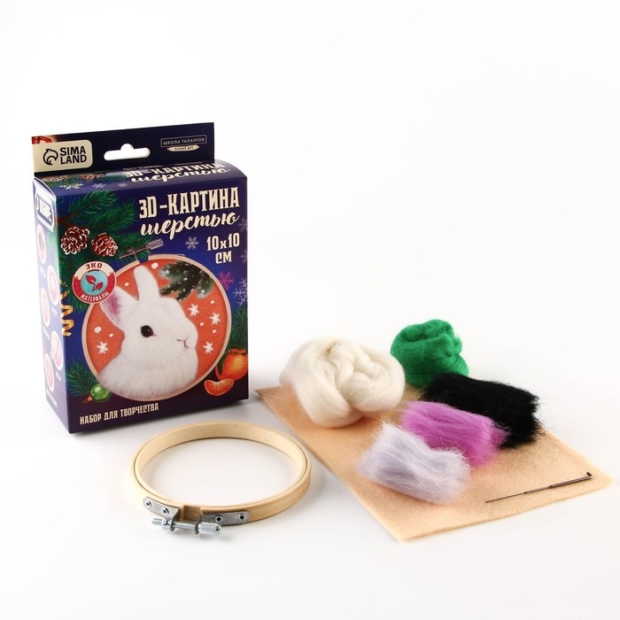 Валяние из шерсти на новый год. Живопись шерстью на пяльцах «Кролик под снегом», 10х10 см