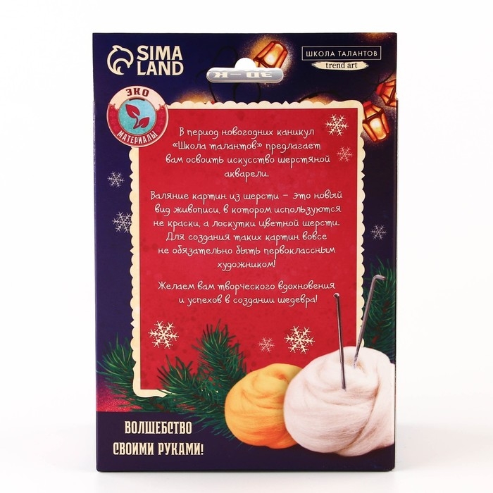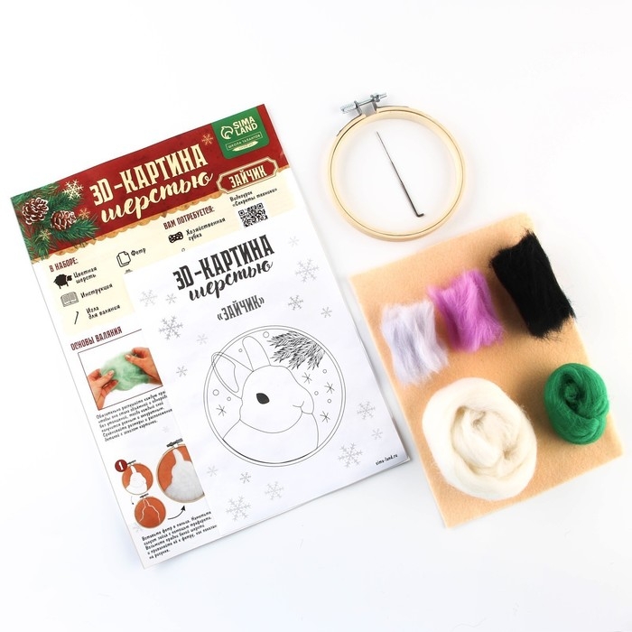 Данный вид творчества основан на валянии. Никогда не слышали о такой технике? Это не проблема: создать мягкое и пушистое панно вам помогут подробные инструкции и видео-мастер-класс, входящие в набор.