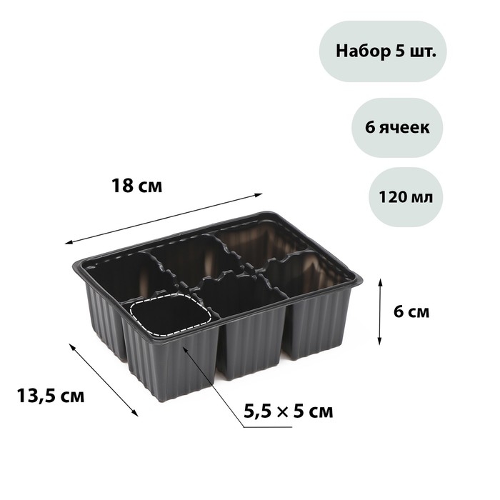 Кассета для рассады, 6 ячеек по 120 мл, набор 5 шт., чёрная