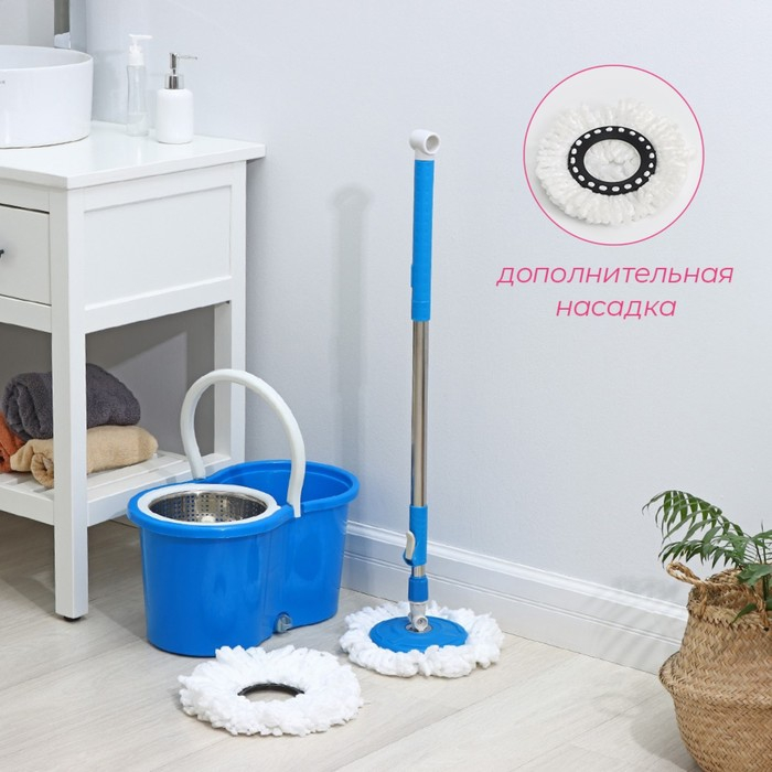Швабра с отжимом и ведро Доляна: швабра плоская, ведро с двумя отсеками, 8 л, дополнительная насадка