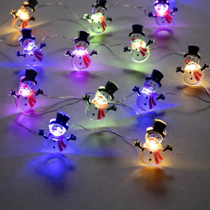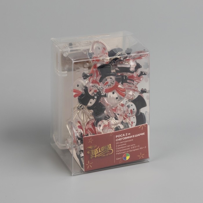 Гирлянда «Нить» 2 м роса с насадками «Снеговик в шарфе», IP20, серебристая нить, 20 LED, 2 режима, батарейки ААх2 (нет в комплекте), свечение мульти