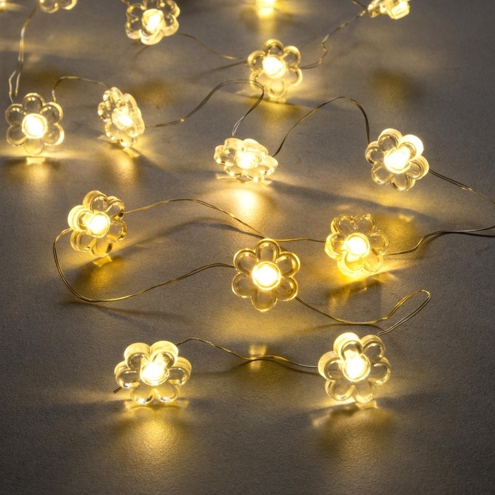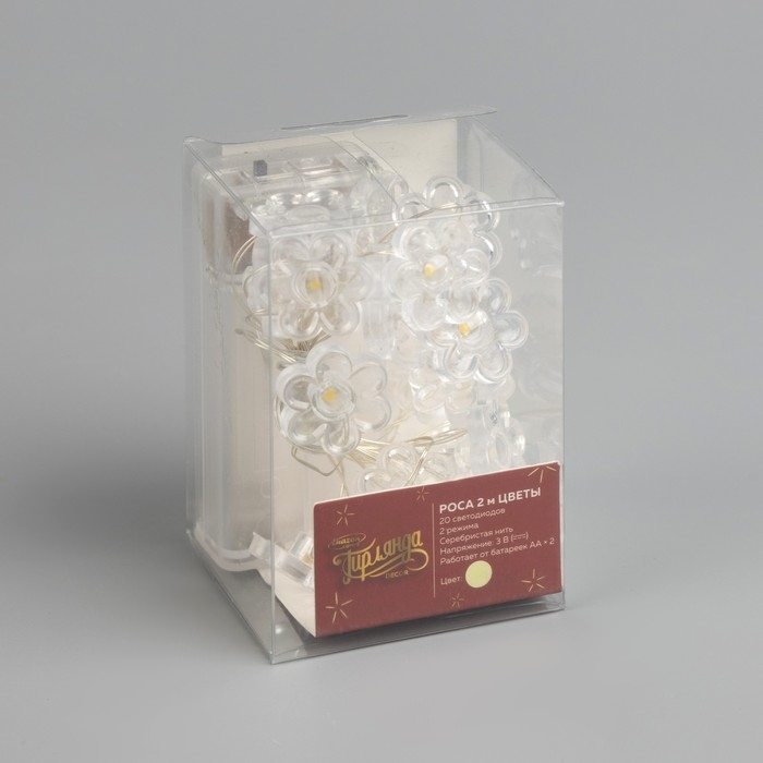 Гирлянда «Нить» 2 м роса с насадками «Цветок», IP20, серебристая нить, 20 LED, 2 режима, батарейки ААх2 (нет в комплекте), свечение тёплое белое