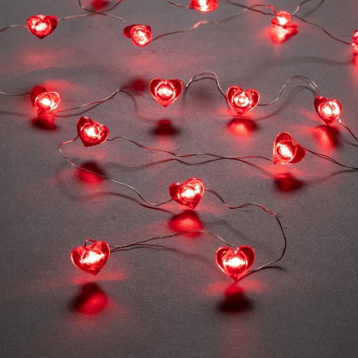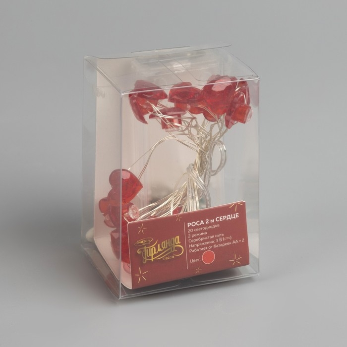 Гирлянда «Нить» 2 м роса с насадками «Сердце», IP20, серебристая нить, 20 LED, свечение красное, 2 режима, ААх2