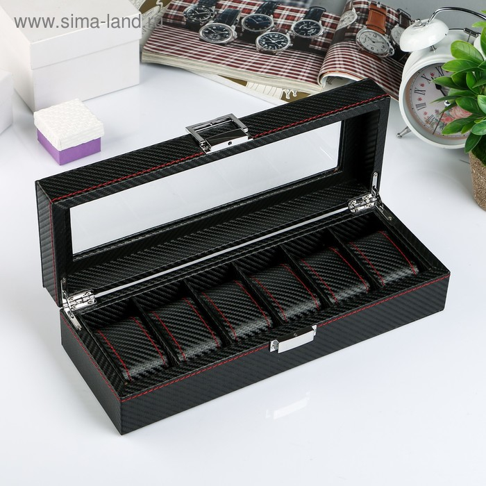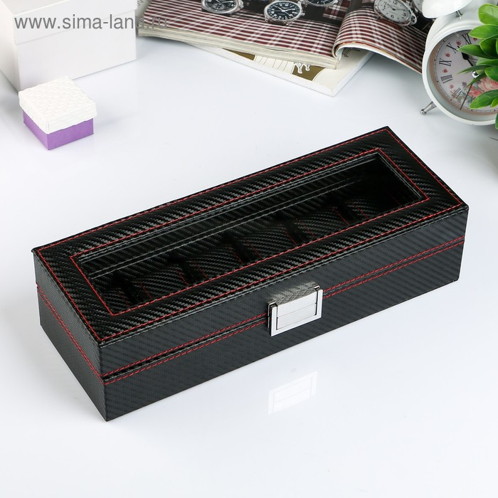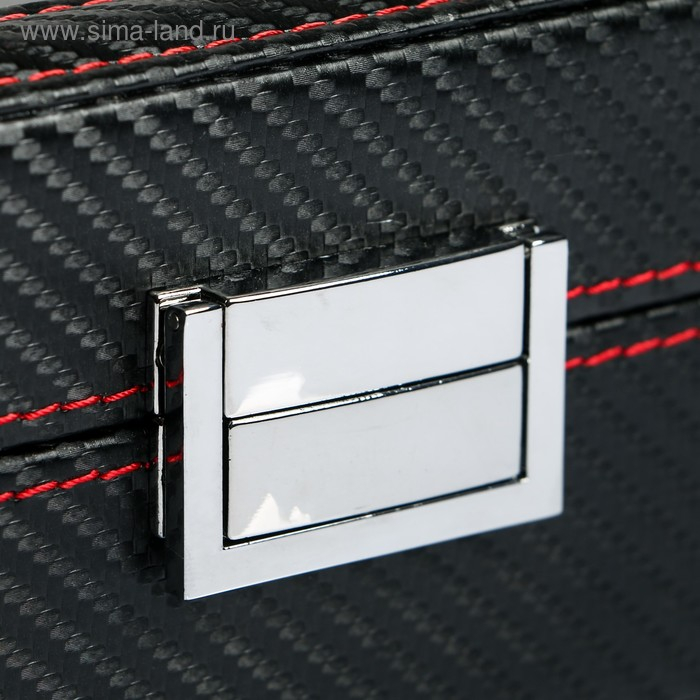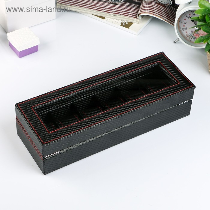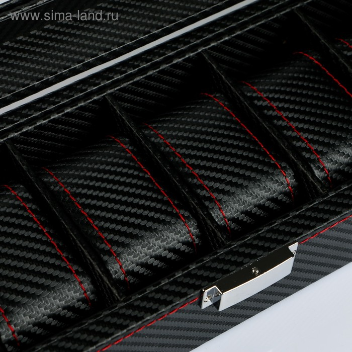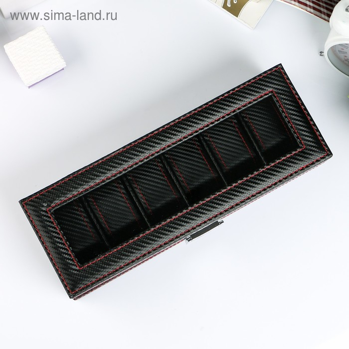 Шкатулка кожзам под часы 6 отделений "Карбон с красной строчкой" 8х33х12 см