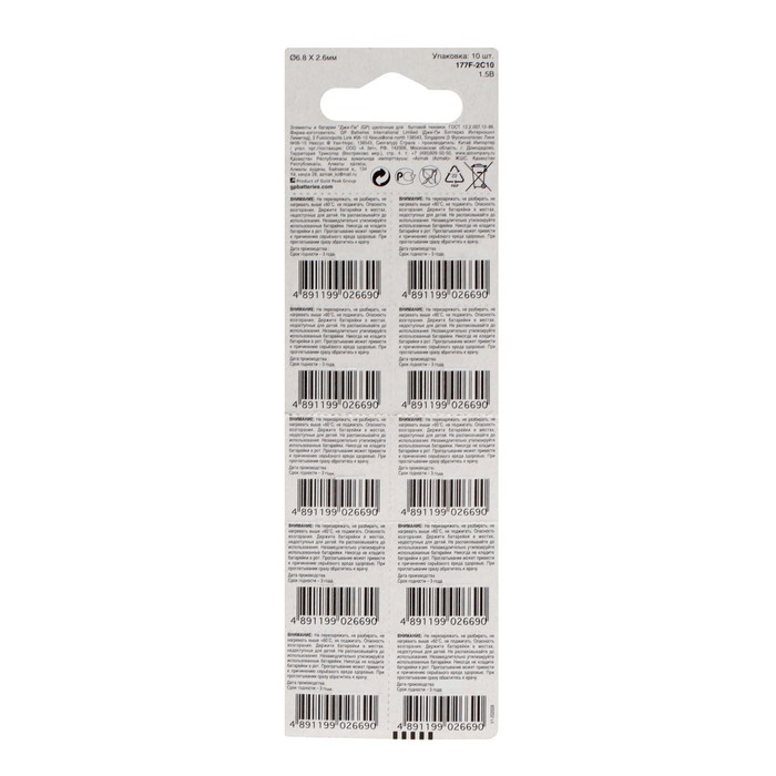 Батарейка алкалиновая GP, 177A (LR626, G4, 177)-10BL, 1.5В, блистер, 10 шт.