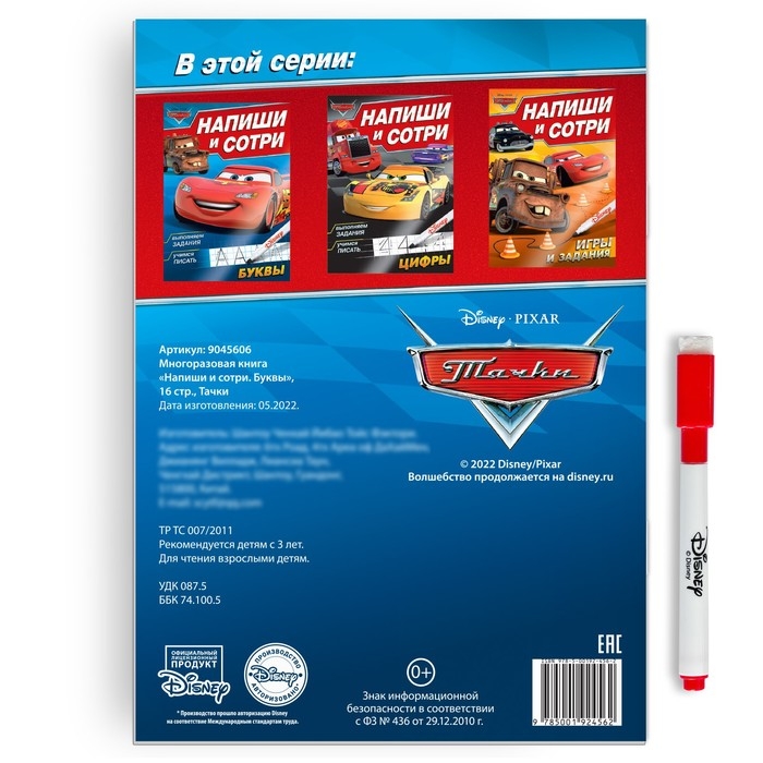 Многоразовая книга «Напиши и сотри. Буквы», 16 стр., 17 × 24 см, + маркер, Тачки
