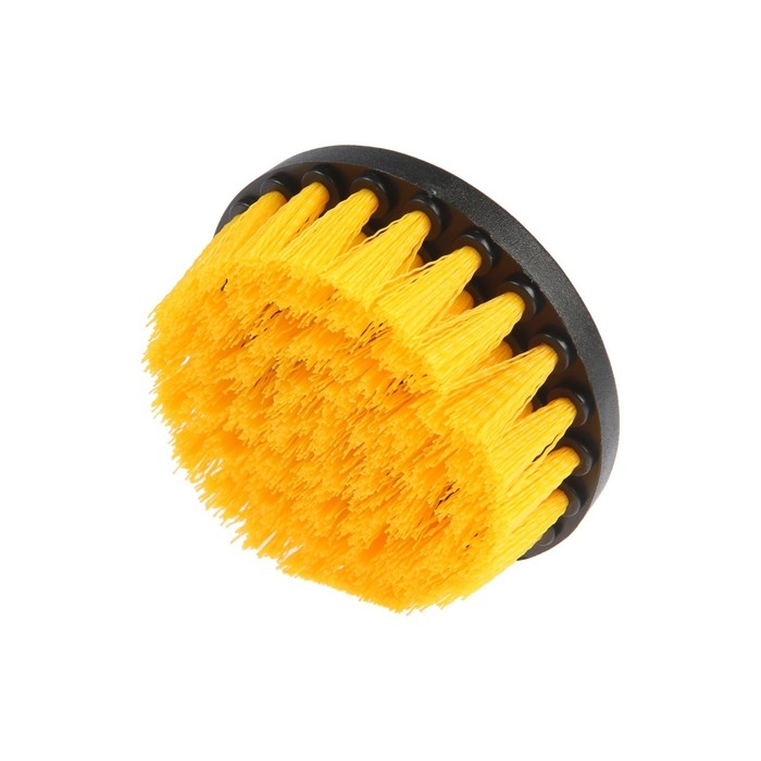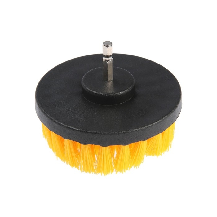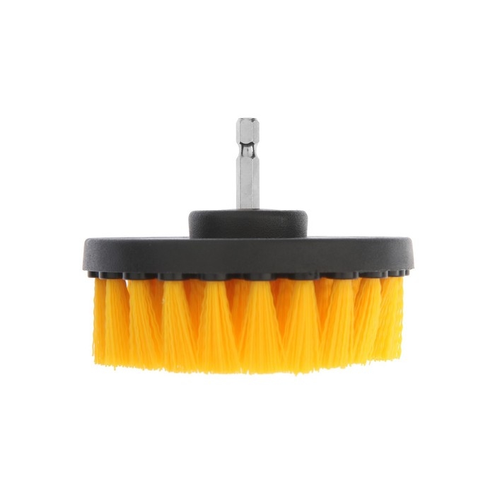 Корпус щётки выполнен из прочного пластика. Щетина выполнена из нейлона средней жёсткости. Диаметр щётки составляет 100 мм, высота 25 мм. Шестигранный хвостовик надёжно фиксируется в патроне инструмента.