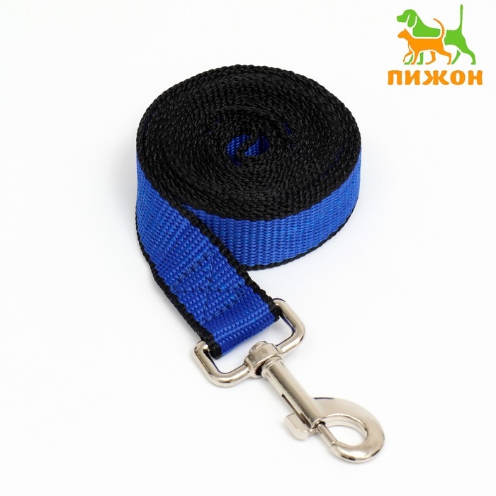Он имеет длину 2 м х 2,5 см, представлен в сине-чёрном цвете. Оснащен карабином на одном конце, чтобы легко присоединить его к ошейнику или наморднику животного.