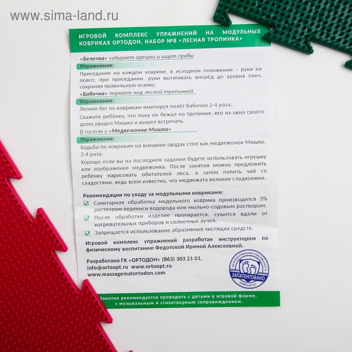 Ортопедическое напольное покрытие состоит из отдельных модулей, которые соединяются между собой по принципу пазла. По массажному коврику можно ходить или выполнять упражнения, стоя на нём. Во время занятий стимулируются рецепторы на стопе и формируются её физиологические своды. Изделие применяется для профилактики плоскостопия у детей, массажа стоп и снятия усталости ног.