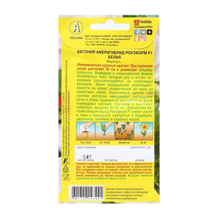 Семена Цветов Бегония "Америгибрид Роузформ", F1, белая, пробирка, 5 шт