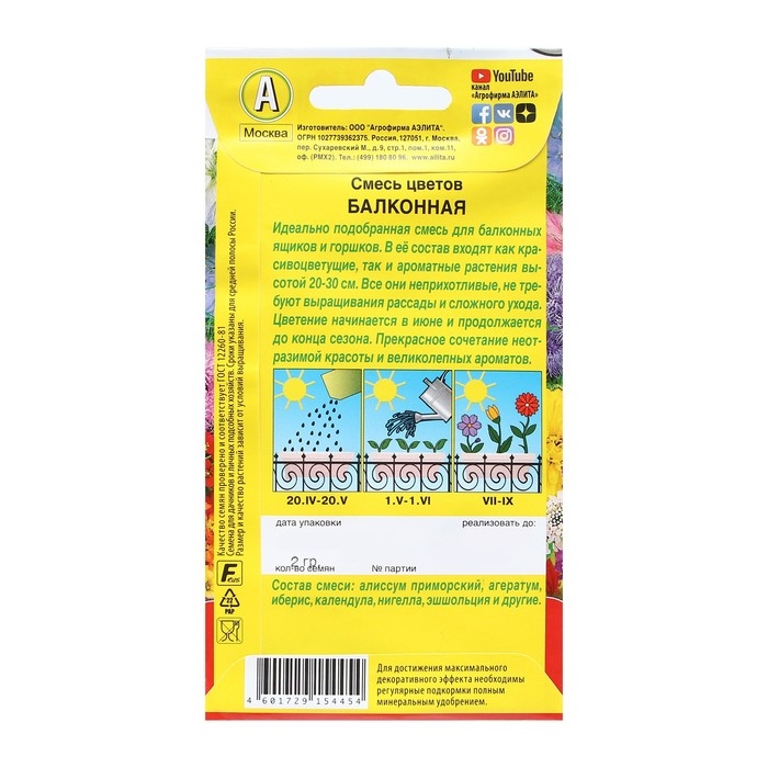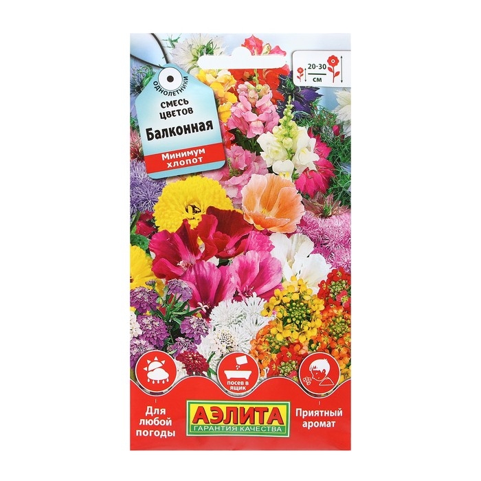 Балконная смесь представляет собой набор семян наиболее эффектных и простых в уходе цветов для высадки на балконе, подоконниках или мини-клумбах в кашпо.