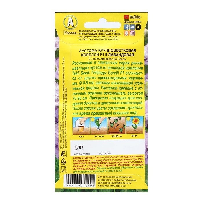 Семена цветов Эустома Эхо Йеллоу желтая, драже, набор 5 шт