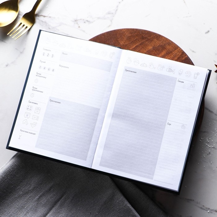 Кулинарная книга - Отличный помощник на кухне, она всегда будет под рукой, в отличие от любых электронных аналогов. Записи позволят не забыть про удачный рецепт, который снова захотите повторить. Для удобства использования, в книге вы можете отмечать сложность, время приготовления, где готовится и количество порций, для каждого рецепта, а так же записывать весь процесс приготовления. Благодаря твердой обложке, книга прослужит долгие годы. А универсальный формат, не займет много места на вашей кухне.
