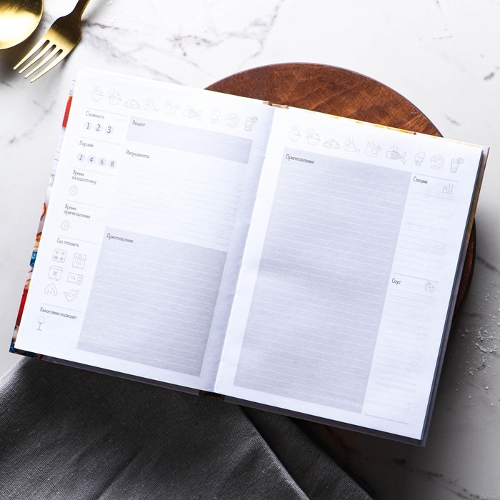 Кулинарная книга - Отличный помощник на кухне, она всегда будет под рукой, в отличие от любых электронных аналогов. Записи позволят не забыть про удачный рецепт, который снова захотите повторить. Для удобства использования, в книге вы можете отмечать сложность, время приготовления, где готовится и количество порций, для каждого рецепта, а так же записывать весь процесс приготовления. Благодаря твердой обложке, книга прослужит долгие годы. А универсальный формат, не займет много места на вашей кухне.