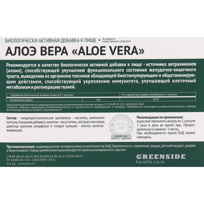 Алоэ Вера,30 капсул по 450 мг
