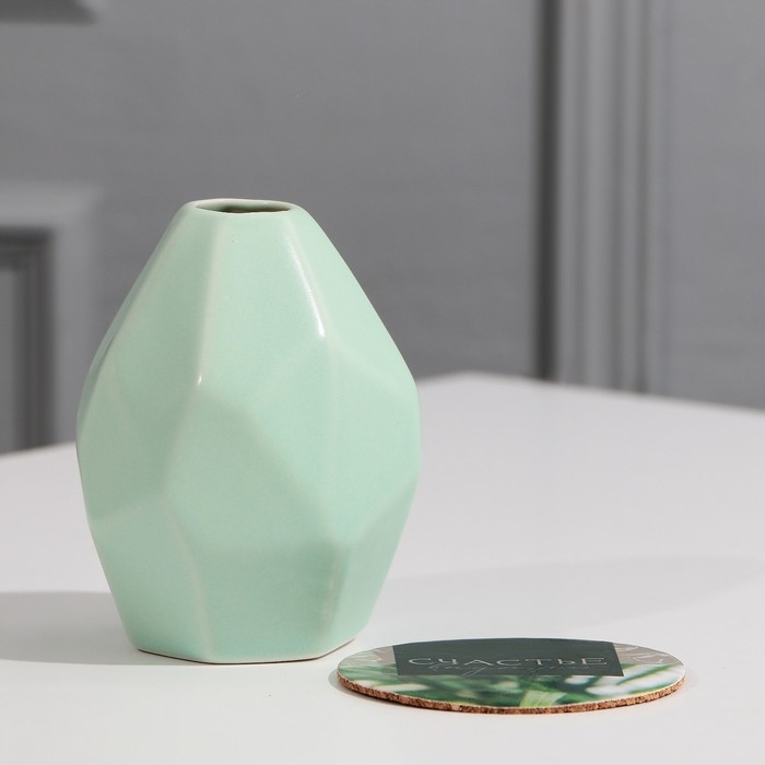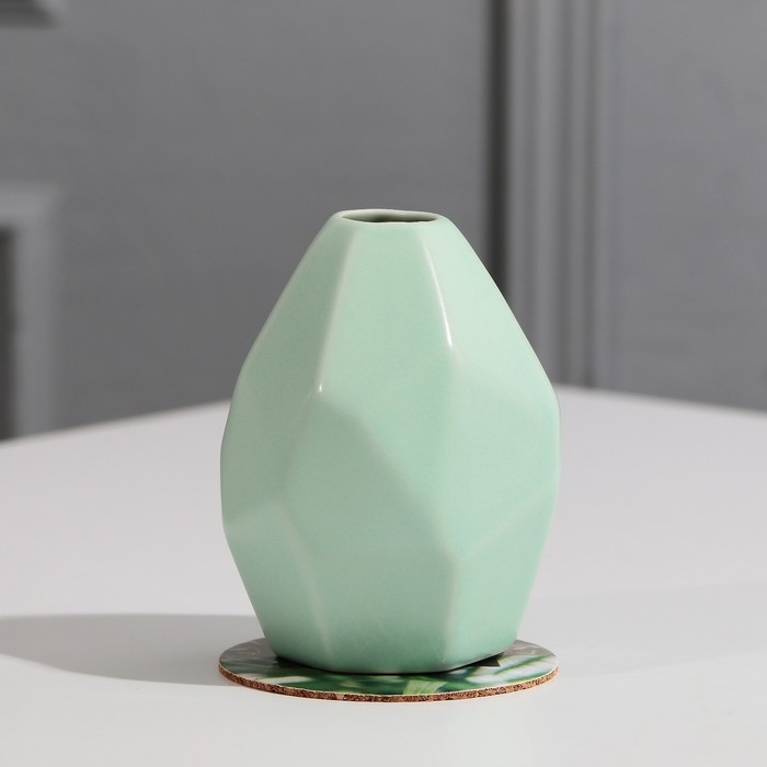 Ваза выполнена в нежно-зеленом цвете из керамики, а подставка – круглая, из пробки с изображением зелени.